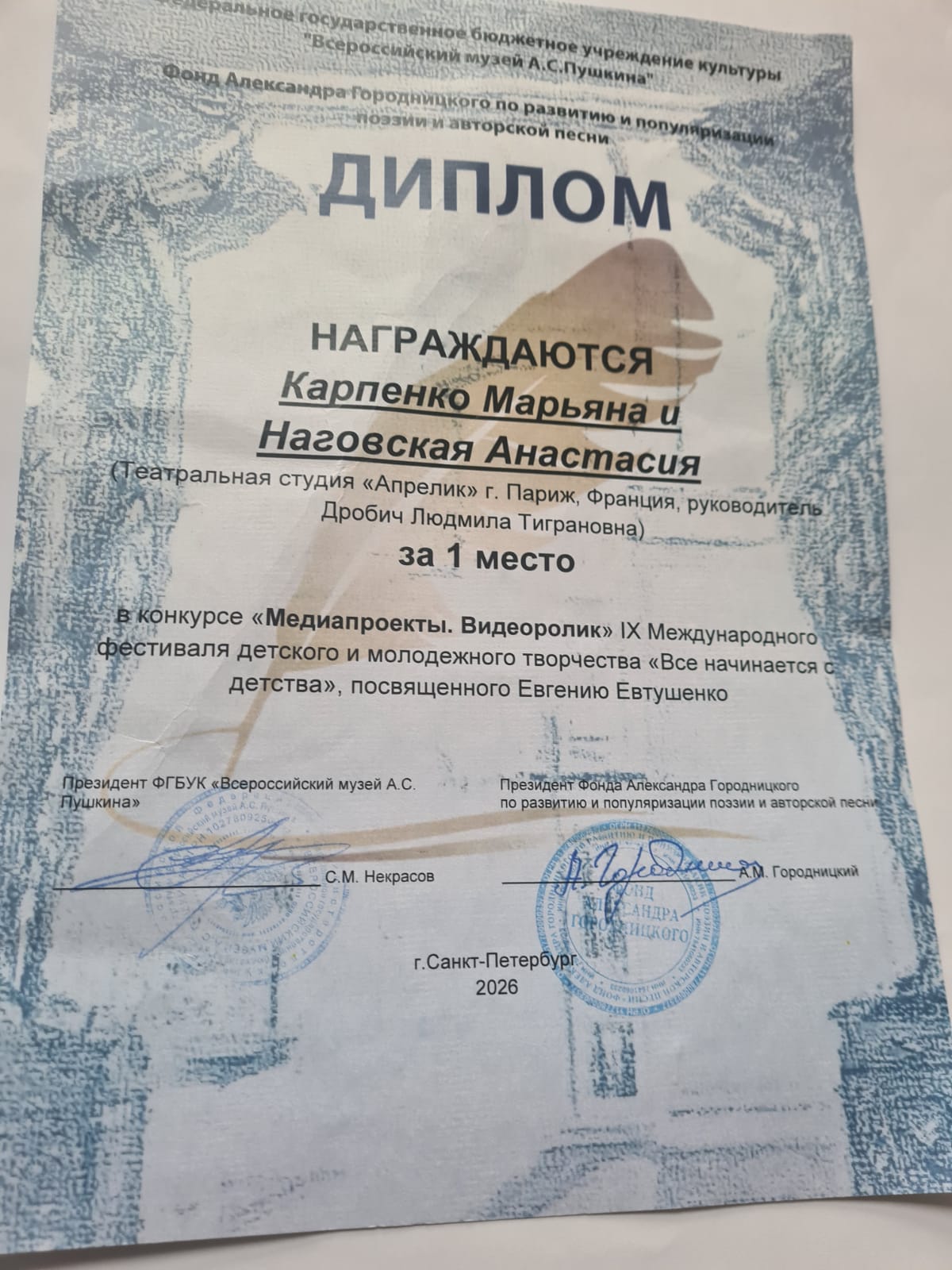 10 АПРЕЛЯ. Санкт-Петербург. Церемония награждения за 1 место на Международном конкурсе А.Городницкого за проект «Евтушенко, Париж,»Апрелик».
