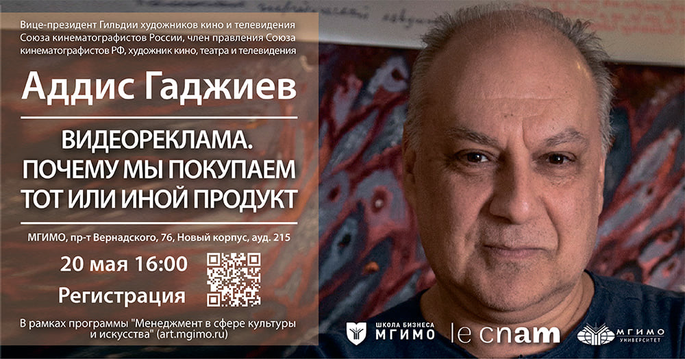 20 мая в 16:00 в ауд. 215 МГИМО состоится мастер-класс Аддиса Гаджиева на тему «Видеореклама. Почему мы покупаем тот или иной продукт».