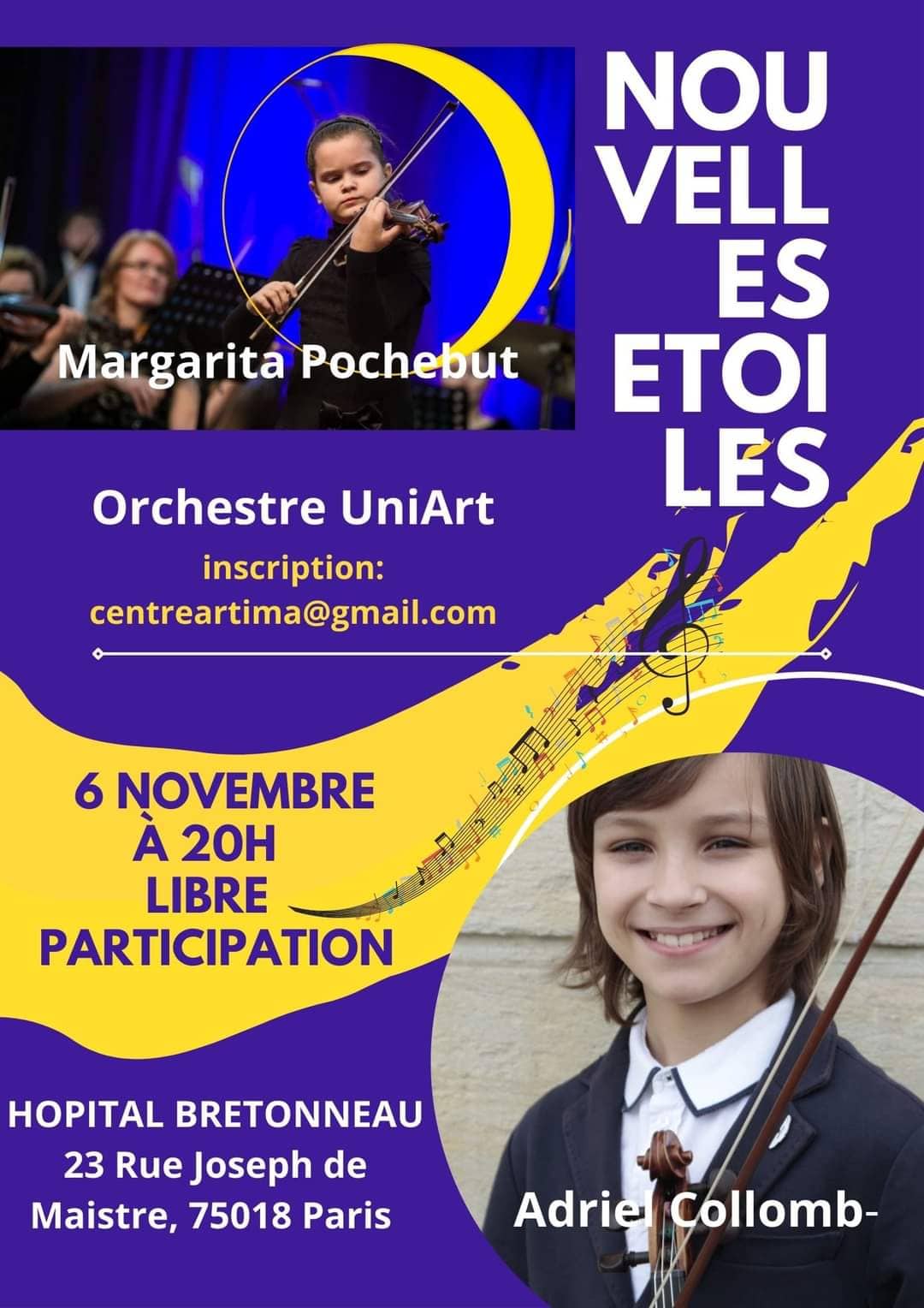 В рамках фестиваля «Nouvelles Etoiles» ассоциация Artima представляет четыре исключительных концерта с участием музыкантов- вундеркиндов из разных стран. Юных музыкантов будет сопровождать международный струнный оркестр «ЮниАрт». Приходите всей семьёй , чтобы поддержать будущие таланты музыкального мира !