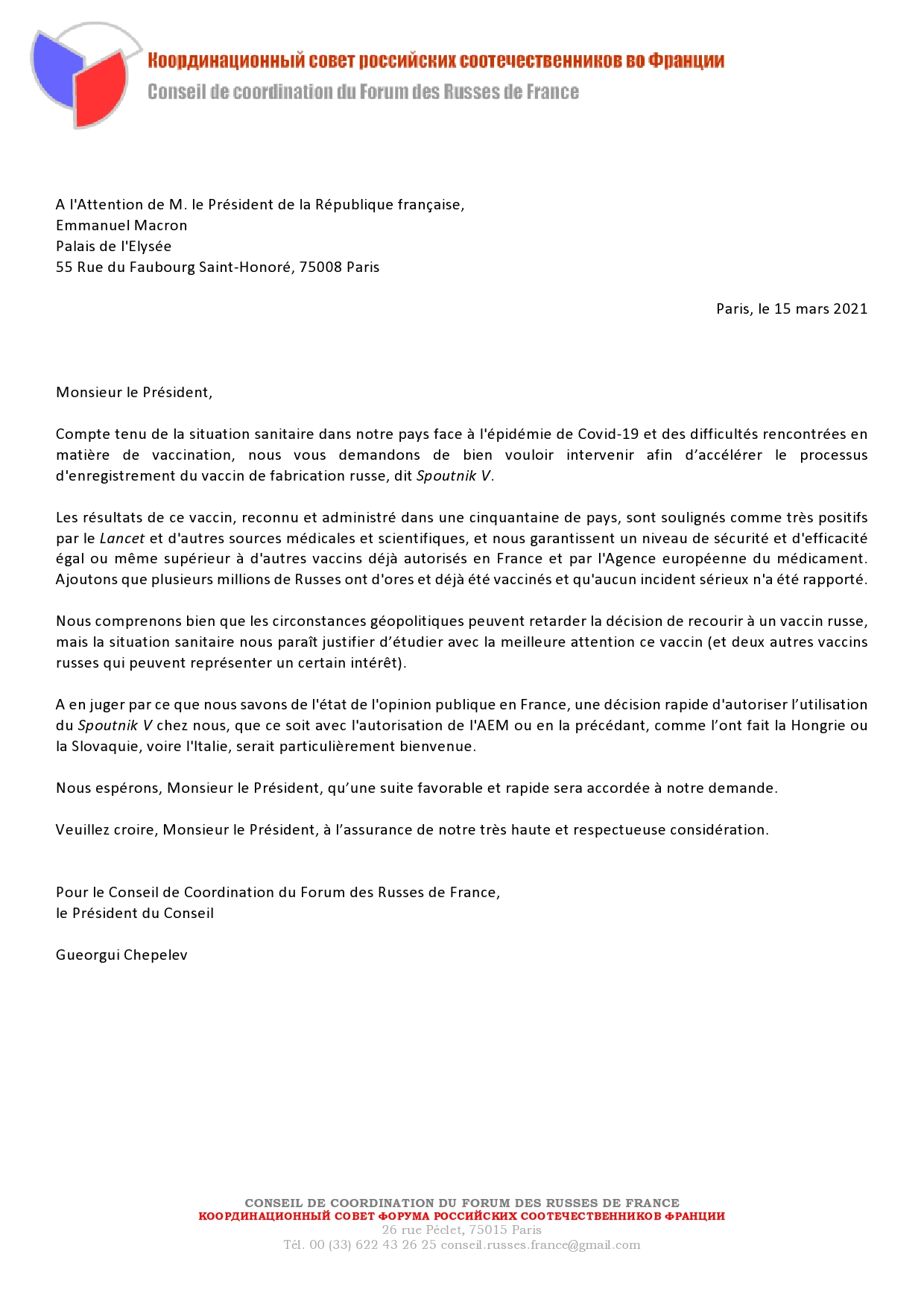 Сделать вакцину Спутник V доступной для жителей Франции. Открытое письмо Координационного совета российских соотечественников во Франции президенту Республики Э.Макрону