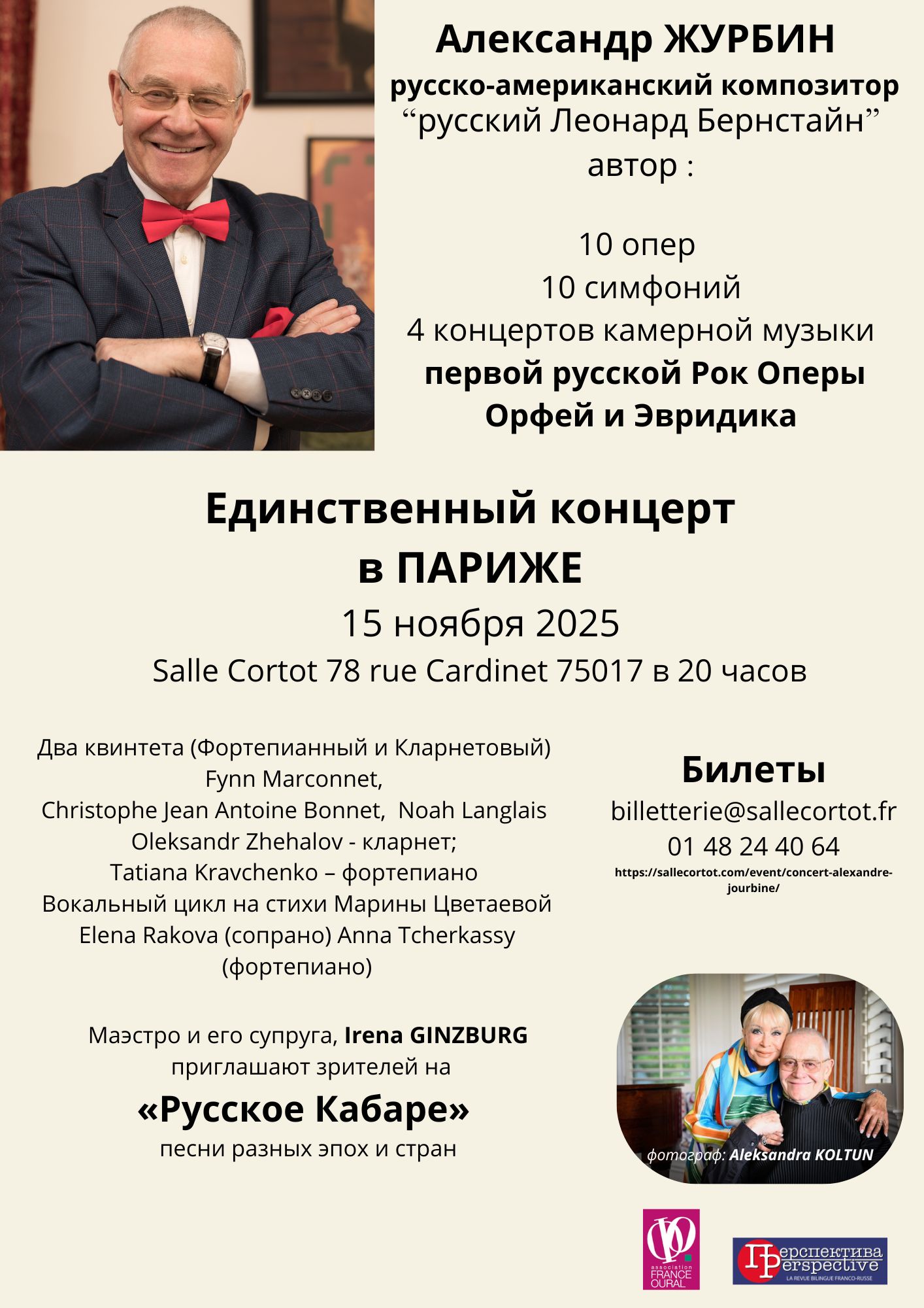 Юбилейный концерт Александра Журбина и его супруги Ирины Гинзбург-Журбиной состоится в Париже, в зале Корто, 15 ноября.