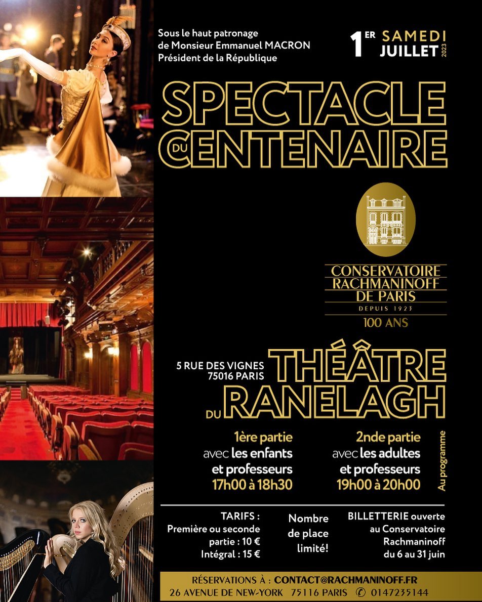 Pour célébrer son centenaire, le Conservatoire Rachmaninoff de Paris réunira sur la scène du Théâtre du Ranelagh les grands talents et promesses nés et grandis au sein du Conservatoire Rachmaninoff. Elèves, professeurs et artistes professionnels de son comité artistique offriront pour cette occasion un panache inédit de musique, de danse et de chant, aux couleurs d’un répertoire riche et ardent.
